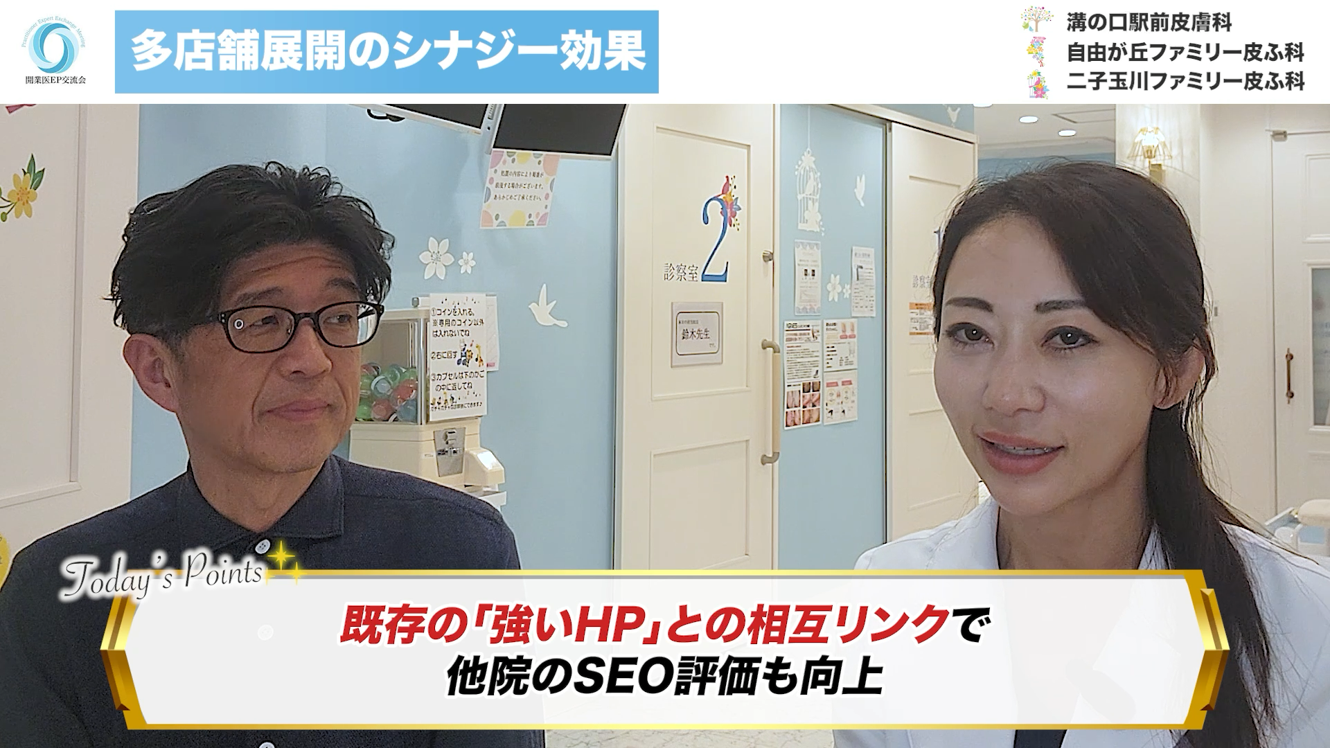 私の場合、10年以上の運用実績がある「溝の口駅前皮膚科」のHPから、新設した自由が丘店や二子玉川店へ相互リンクを貼ることで、新院のSEO評価(検索順位)を引き上げています。