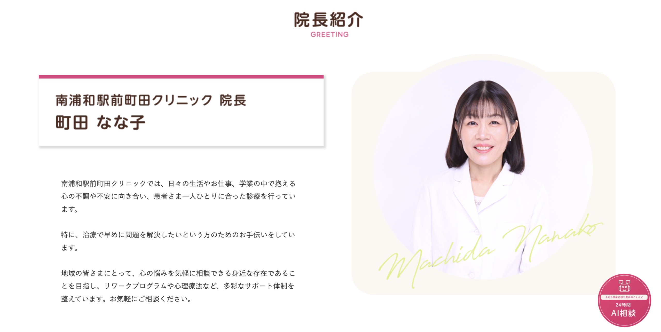町田なな子先生(町田クリニック): 南浦和駅の「東口」と「西口」の両サイドで展開し、駅利用者や地域住民を逃さない体制を築いています。